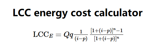 The LCC Energy Cost Calculator computes the present value of future energy costs for energy-using devices and systems, accounting for escalating energy prices. The formula is: